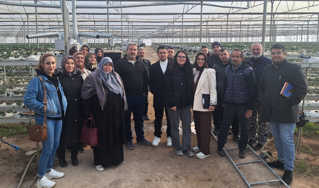Halkapınar'da örtüaltı sebze yetiştiriciliği eğitimleri kapsamında gerçekleştirilen teknik gezide, kursiyerler Zengen ve Tont mahallelerinde topraksız tarım yöntemiyle çilek üretimi yapılan modern seraları yerinde inceledi.
